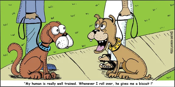 “My human is really well trained. Whenever I roll over, he gives me a biscuit!”