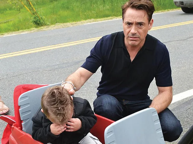 Rober t Downey Jr. comforts a little boy after the boy burst into tears when he saw ‘Iron Man’ dressed in just a polo shirt and jeans.