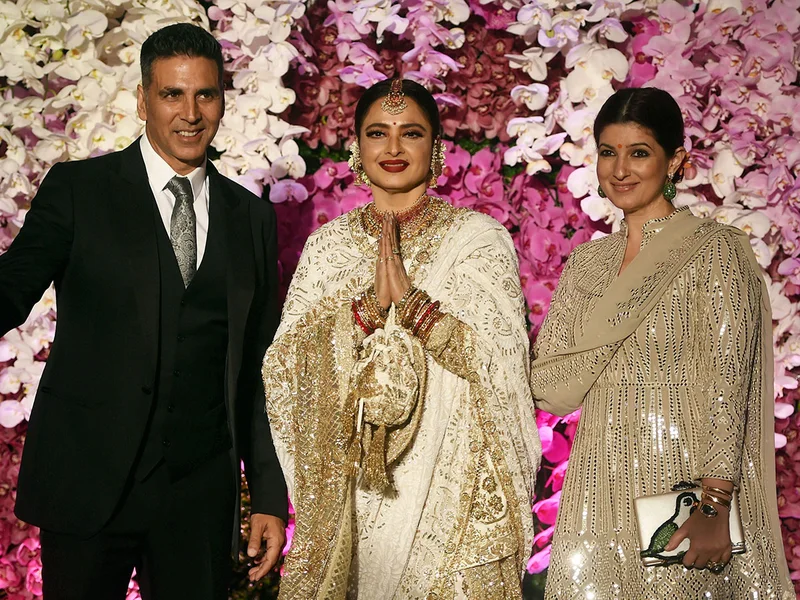 Akshay Kumar and his wife Twinkle Khanna pose with the beautiful Rekha.