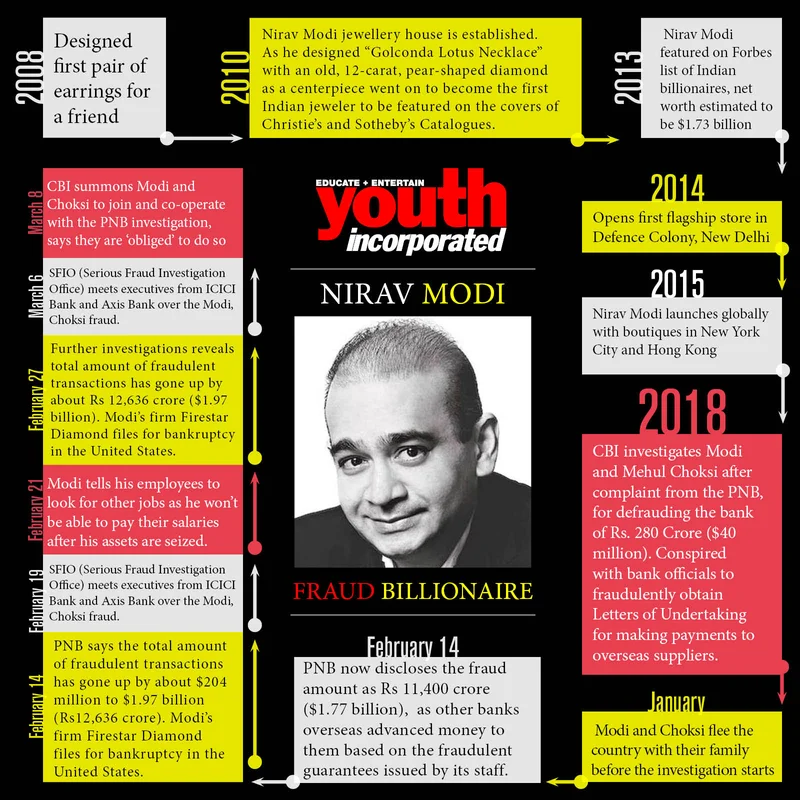 It’s interesting that when people apply to banks for loans to make homes and pursue higher education, most are often denied loans on the account that their personal assets aren’t strong enough for the bank to guarantee their money back. yet in the case of Nirav Modi all his seized cars, watches and other flashy assets won’t make up for the 13,500 crore the bank has lost in loans.