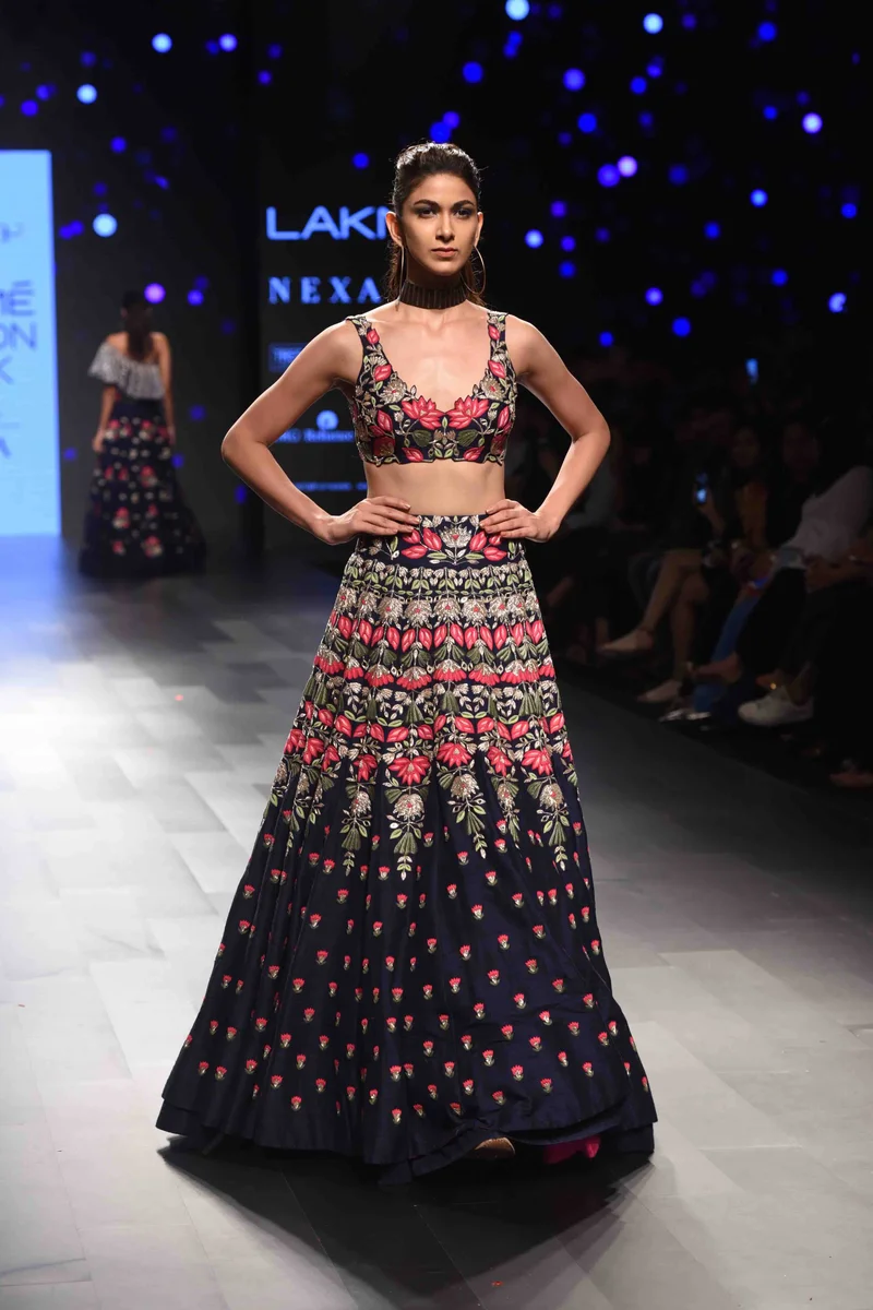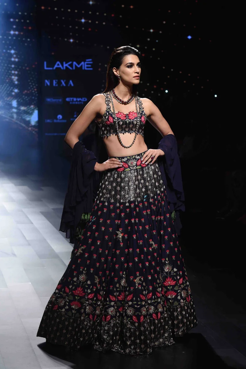 Kriti Sanon took to the ramp looking pretty in a midnight blue high-waisted lehenga with lotus thread and small cutdana embroidery highlighted with 3D mirror and thread work. This was teamed with a tiny lotus and cutdana blouse and a long ruffle trail dupatta added to the contemporary yet modern and sophisticated theme to the collection