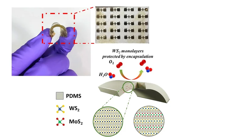 The results have been impressive. The team demonstrated that encapsulating monolayer WS₂ in PDMS maintained stability for over a year without any signs of oxidation and degradation. Vertical stacking of WS₂-PDMS layers enhanced optical absorption by more than fourfold while preserving the intrinsic properties of the monolayers. The composite exhibited excellent flexibility and durability, withstanding thousands of bending cycles without delamination.