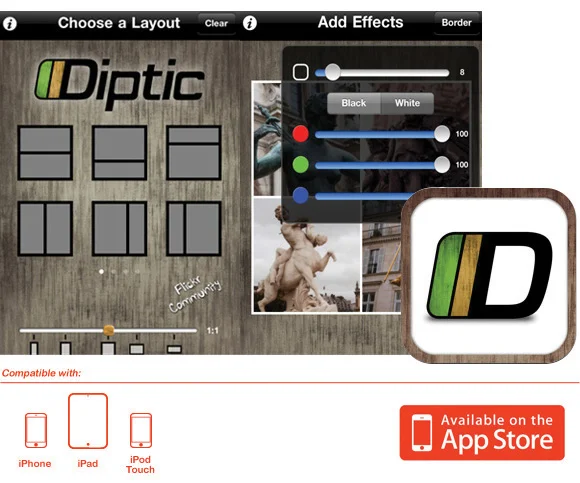 Diptic is a fun application which allows Apple users to lay images on different preset layouts and make photo collages which can be shared later. The layouts can be adjusted by the user to fit a style which is most suitable and effects can be added to the images which include colour correction, filters, gradients, etc.