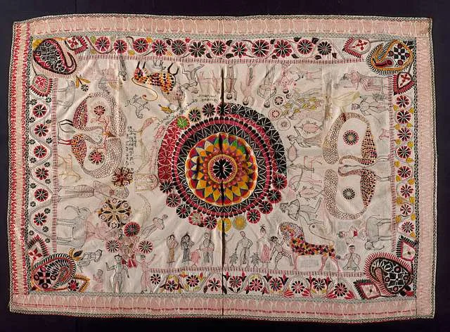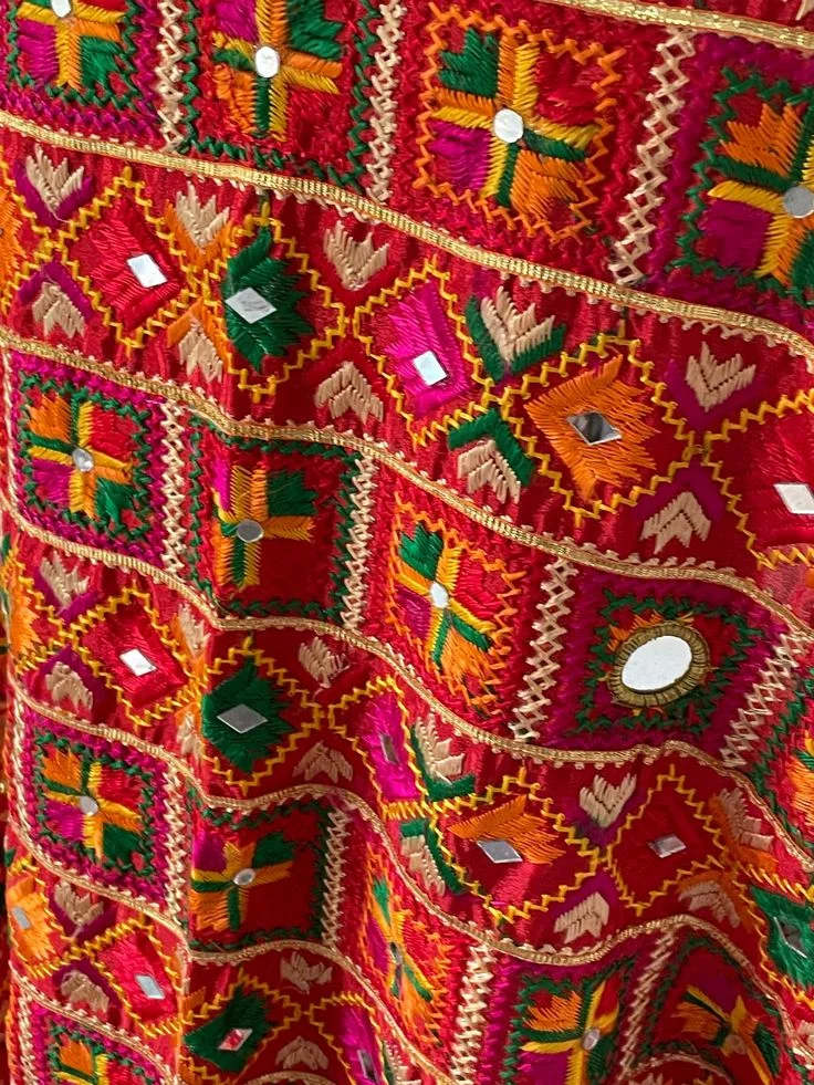 Indian hand embroidery, which is highly sought after by the nomadic Banjara tribes, is an artistic form that has travelled far and wide and influenced many locations with its distinct style. These Banjara tribes travelled and shared their needlework skills, inspiring various regions to create their own patterns and techniques. Starting with a canvas made of vividly colored fabrics, craftspeople use cross-stitches to create geometric shapes like triangles and squares, as well as complex chain stitches and a unique quilting stitch to create eye-catching patterns. Mirrors and beads are frequently added to the embroidery to enhance its allure and lift the work to a truly enchanting level of craftsmanship.