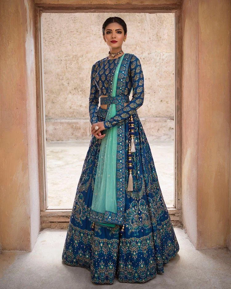 Belted Lehengas: Cinch the Drama- WOW! A belted lehenga can make the outfit go from ‘classic’ to ‘red-carpet-ready’ in no time. Go for a metallic belt if wanting to look super flashy, or opt for a soft fabric belt if wanting a romantic look, just like in the latest collections of Anita Dongre and Manish Malhotra. The belt firmly holds the dupatta and skirt making a flattering silhouette which is not affected by the festivities.