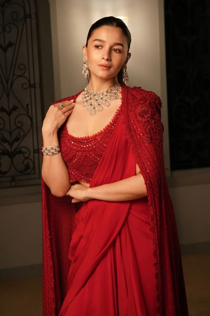 Cape-Style Pallus: Saree with a Twist- Always have seen cape style tops, dresses but ever wondered what a cape- style pallu on your saree would look like? Drape your pallu like a cape for a superhero-meets-ethnic vibe. Flowing, dramatic, and oh-so-chic, this style instantly adds volume and oomph to your outfit. Bonus: you’ll have fewer pallu-related wardrobe malfunctions because… hello, no slipping pallu! Many bollywood stars and actress Alia Bhatt have been spotted rocking this look at festive events, making it an Instagram-worthy trend.