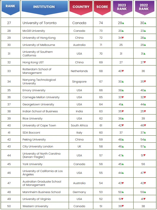 Looking at how the Indian business schools have fared this year, we see that the Indian Institute of Management (IIM) Ahmedabad has been making steady growth in the past three years, securing the eighth position this year, after holding the eleventh position in 2023 and fourteenth position in 2022. IIM Calcutta is also climbing up by securing the fifteenth position this year, in opposition to its nineteenth position in 2023. Under the top 50 category, apart from IIM Ahmedabad and IIM Calcutta, only the Indian School of Business has secured the 38th spot down from the 35th spot in 2023. SP Jain Institute of Management still hasn’t made it back in the top 50 category, maintaining its position fifty-sixth position this year as well.