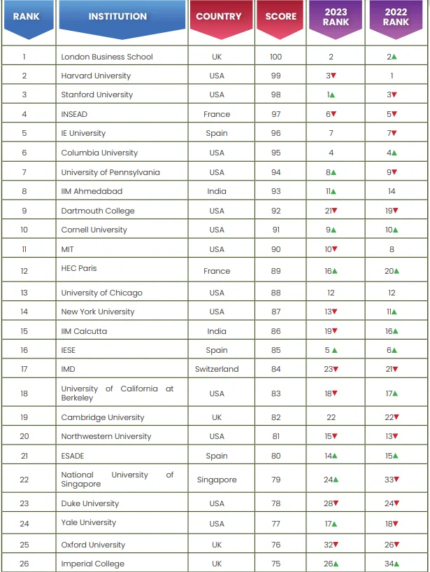 The Global Business School Rankings 2024 have reflected greatly on London Business School, which has come to the top after retaining its position in the second for the past two years. Harvard University has climbed up from its third position in 2023, to the second position this year. Unfortunately, Stanford University has lost its crown and has fallen down to the third position this time. INSEAD has jumped up two positions in the past year, going from sixth in 2023 to fourth in 2024. After maintaining its seventh position for two years in a row, IE University has placed itself among the top five this time. Columbia University, on the other hand, held its position at fourth for two consecutive years and fell down to sixth this year. The University of Pennsylvania is slowly climbing the ladder, going ninth in 2022, eighth in 2023, and seventh in 2024. IIM Ahmedabad has made its mark by coming in the eighth position, jumping up from eleventh in 2023. Dartmouth College has shown remarkable improvement, going from the twenty-first position in 2023 to ninth this year. From being in the ninth position in 2023, Cornell has slipped down to the tenth position in 2024.