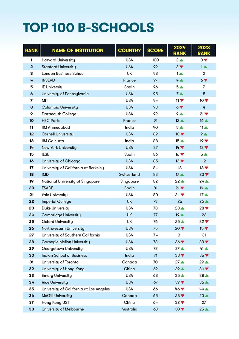 The Global Business School Rankings 2025 have seen notable shifts compared to the previous years. This year Harvard University has reclaimed the first position after two years, while Stanford University has moved to the second from its third position 2024. London Business school that ranked first in 2024 has dropped to its third position. INSEAD has held its fourth position the same as last year. IE University has also remained in its fifth position similar to last year. The University of Pennsylvania has climbed to the sixth position from its eighth position. MIT college has shown remarkable progress by positioning itself as seventh from its eleventh position in 2024. As for Columbia University this year it has seen a dip by falling down to the eight position compared to its 6th position in 2024 and fourth position in 2023. Dartmouth College has remained in the same position as last year standing ninth in the list. This year HEC Paris has made it to the top ten by standing tenth making great improvements from its twelfth spot in 2024 and sixteenth spot in 2023.