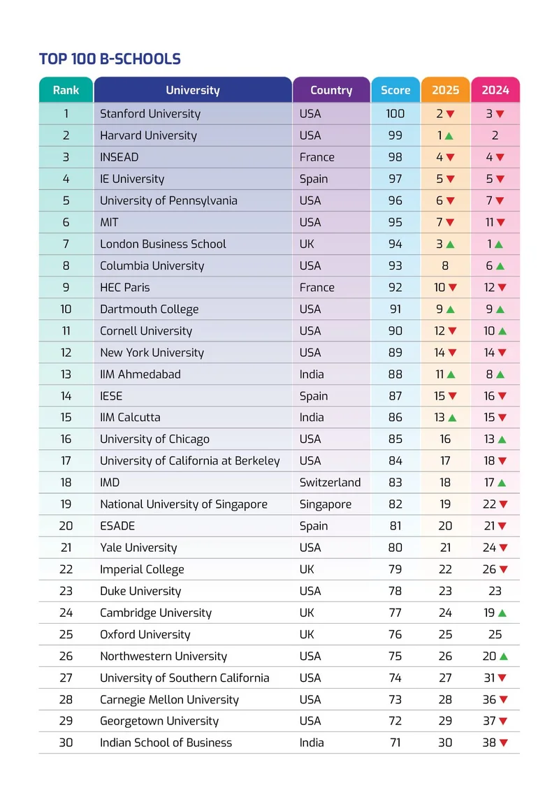 The Global Business School Rankings 2026 reflect a year of relative stability among the world’s elite institutions. Stanford University and Harvard University continue to hold their first and second positions in the MBA rankings as both institutions demonstrate strong academic standards, influential alumni networks and their graduates achieve successful career results. This year, Stanford University has reclaimed the first position, climbing from the second place in 2025 and third position in 2024. Harvard University has dropped to second place after leading the first place last year. INSEAD University has moved to the third position from its fourth place in 2025, while IE University has reclaimed the fourth position compared to its fifth position in 2025 and 2024. The University of Pennsylvania (Wharton) has shown remarkable progress by now standing in the top 5 at the fifth position compared to its sixth and seventh in the previous years.