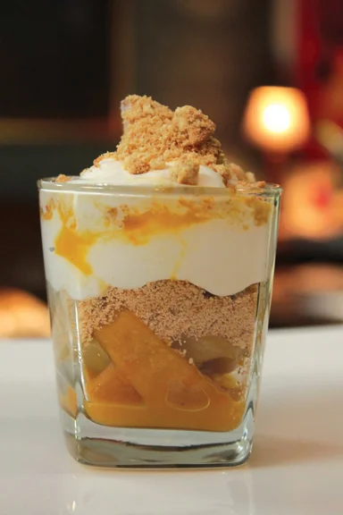 - In a glass, layer the fruits at the bottom, then layer the biscuits and top it up with a layer of cream. Garnish with a wedge of stewed fruit.