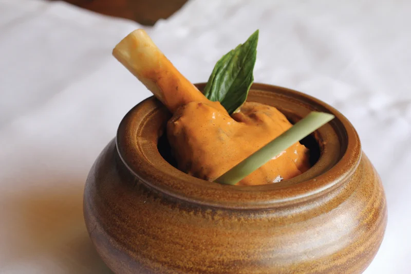 4. In a flat-bottomed vessel heat some oil. Add curry leaves and then add the paste. Fry the paste over low heat and add the coconut cream, lamb stalk, basil puree, tamarind pulp and coconut milk powder. Simmer the curry for 10 minutes. Check seasonings.