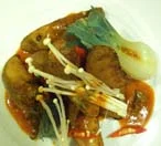 - Heat the oil in a wok. Sauté garlic and add curry paste. Cook it with little stock or water and add the potatoes, pakchoy and enoki mushrooms. Toss and adjust the seasoning.