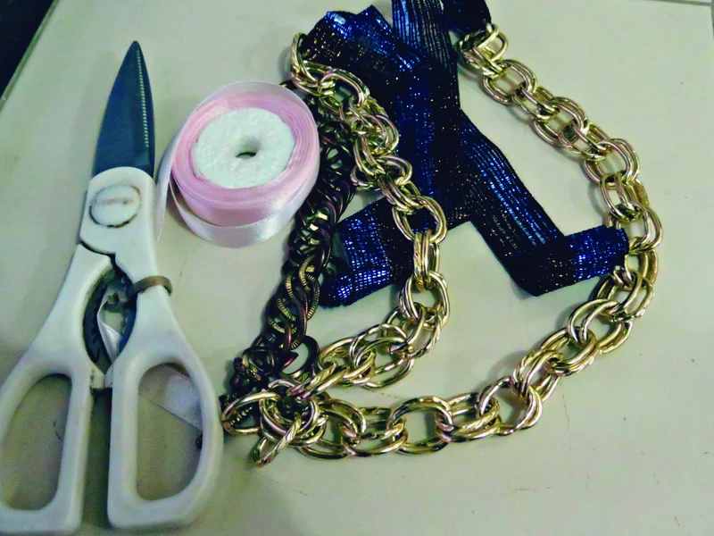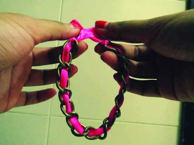 Unleash your creative pangs and pick ribbons that appeal to you and move them back and forth into each chain link to intertwine the chain and ribbons together. Remember to make a loop at each end.