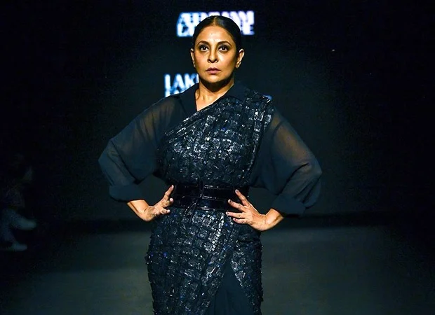 Shefali Shah radiated glamour as she took the runway as the showstopper for Abraham & Thakore’s collection, wearing a breathtaking sequin saree. Her outfit featured a striking jet-black sari crafted from garbage bags and discarded CDs, beautifully embodying the theme of “finding beauty in what the world has discarded.”