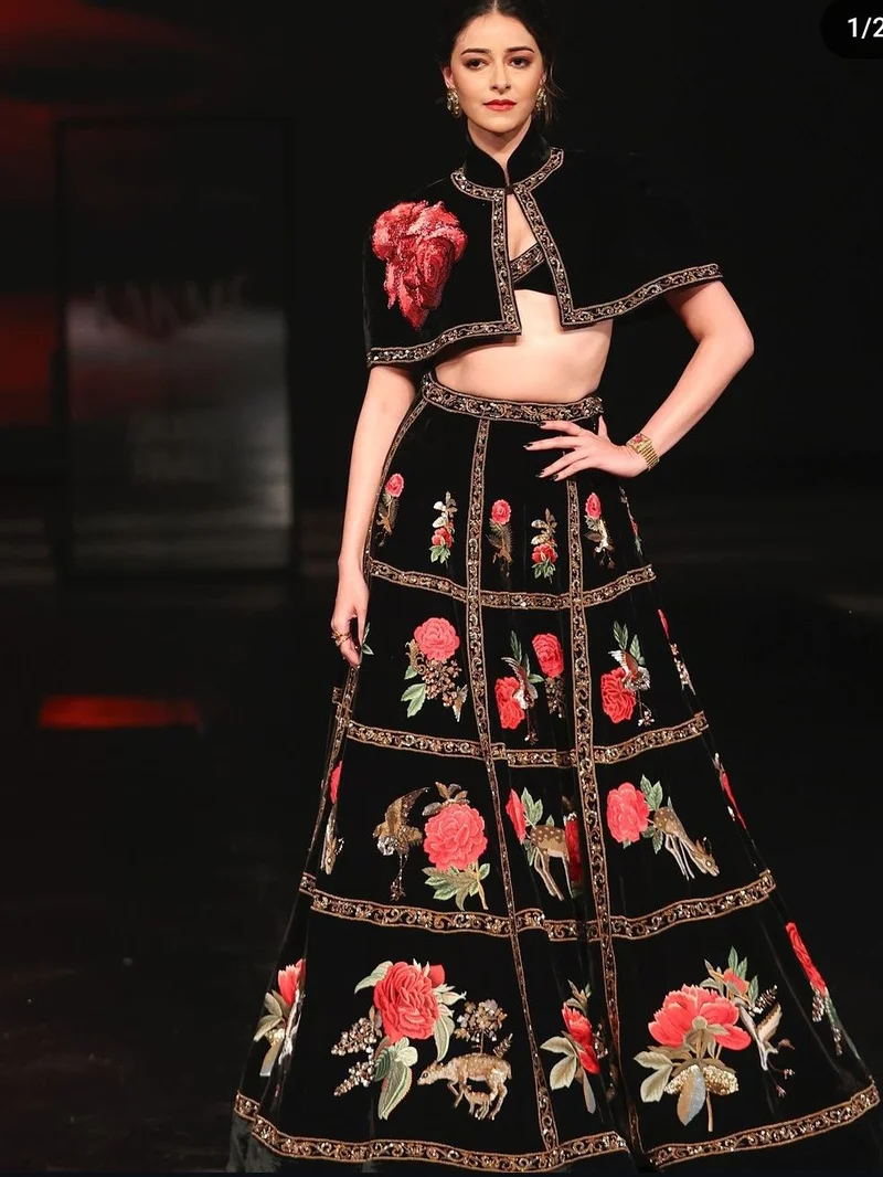 Ananya Pandey took the runway as the showstopper for Rohit Bal’s collection, Kaaynat: A Bloom in the Universe, wearing a stunning red and black embroidered gown. The actress wore a floral lehenga set featuring a heavily draped skirt, a blouse, and a short cape. She complemented her look with natural makeup, a bold red lip, and a messy bun.
