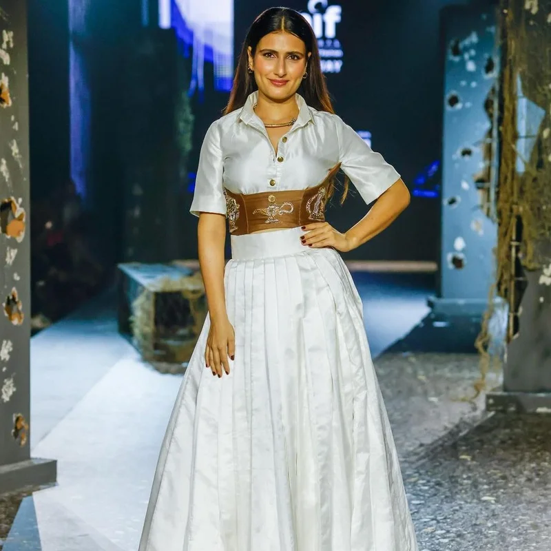 Fatima Sana Shaikh dazzled as the showstopper for the ‘Chor Bazar’ collection by NIF students Chetan Mali and Mahendra Choudhary showcase their talent. She looked radiant in a fitted ivory outfit with an off-white shirt and a flared skirt cinched with a bold brown belt, complemented by minimal makeup, sleek hair, and elegant gold jewelry.