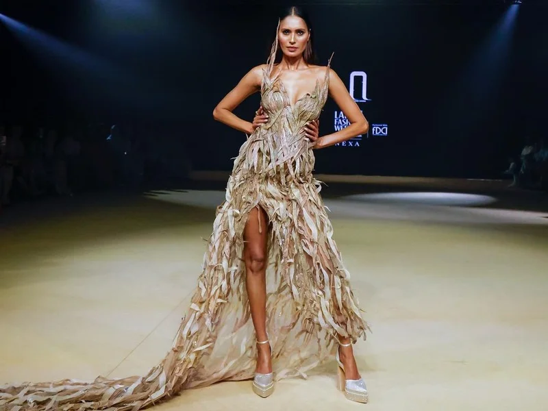 Indian supermodel Ujjwala Raut closed the show for designer Abhishek Sharma in a stunning beige gown featuring intricate detailing, a thigh-high slit, and a dramatic feather-like train. Inspired by Indian grasslands, the gown utilized layered fabrics shaped like blades of grass. Sharma’s collection beautifully combined kantha embroidery, 3D embellishments, draping, and beadwork for a striking dramatic effect.