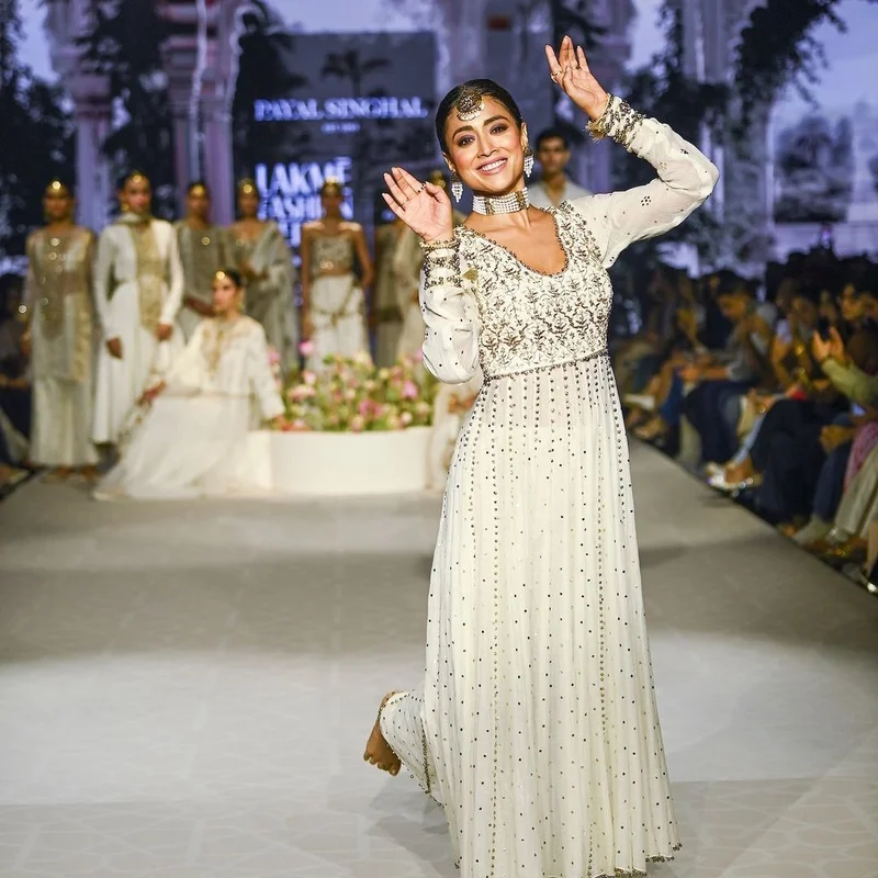 South Indian actress Shriya Saran lit up the runway as the showstopper for designer Payal Singhal. Adorned in an elegant ivory and gold anarkali, complemented by a white necklace, she captivated the audience with a mesmerizing Umrao Jaan-inspired Kathak dance set to the enchanting beats of ‘In Aakhon Ki Masti’.