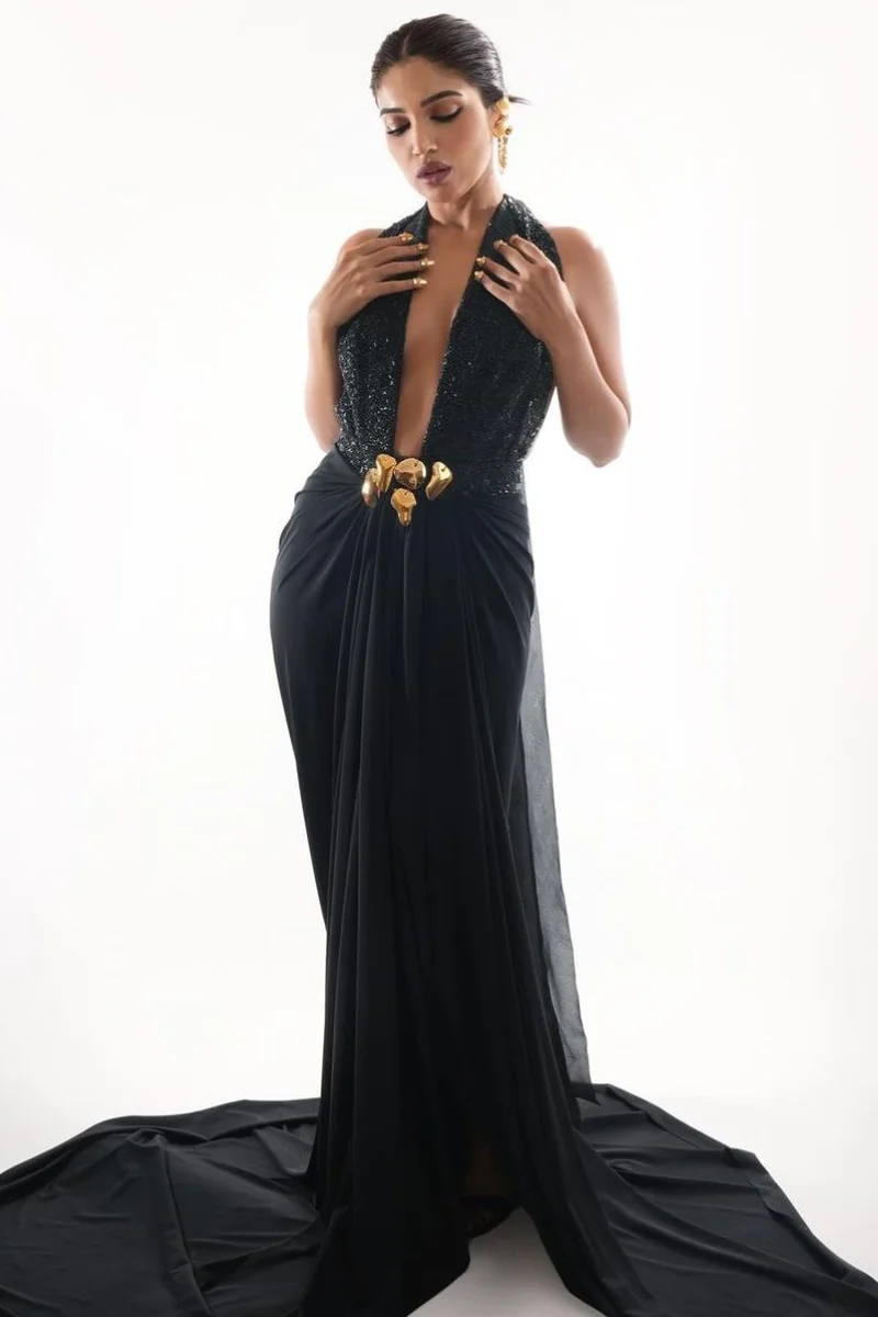 Bhumi Pednekar dazzled as the showstopper for designer Richa Khemka, wearing a stunning black net and shimmer dress with a fishtail silhouette. The outfit featured a striking long tail, complemented by gold accessories and a bold gold belt that highlighted the dress beautifully. She finished the look with a sleek bun hairstyle.