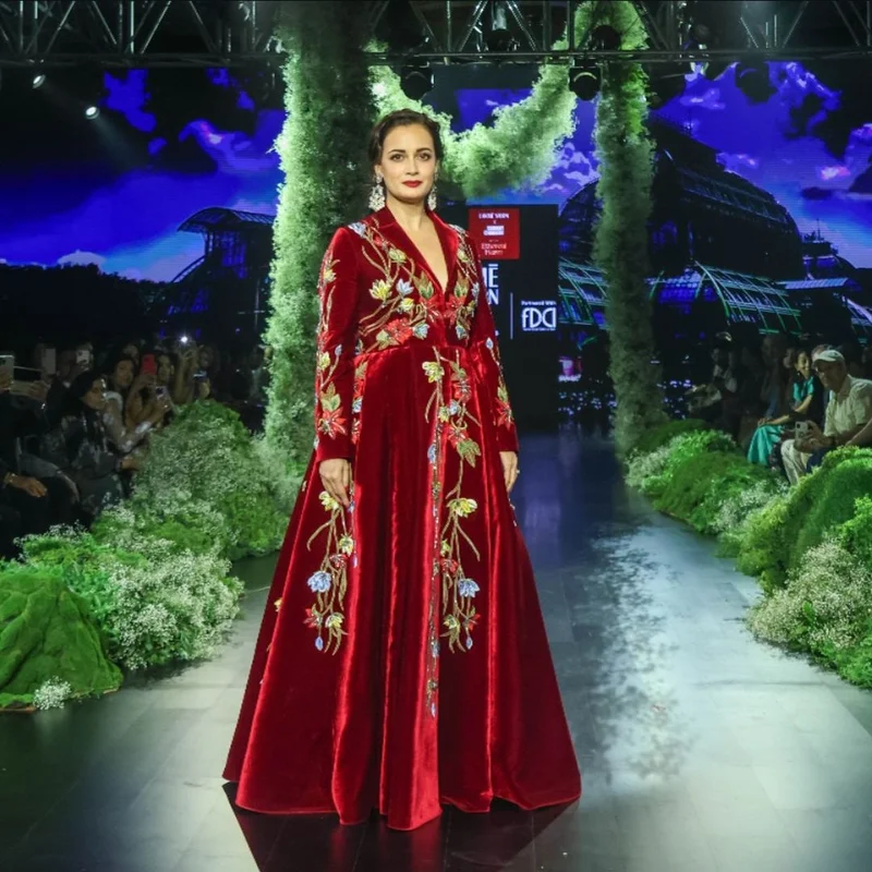 Dia Mirza walked the runway for designer Samant Chauhan’s bridal collection, Ethereal Bloom. She wore a velvety red gown adorned with floral accents, perfectly reflecting the beauty of flowers and paying homage to the collection’s theme. Her look was enhanced by stunning Indian earrings and a touch of red lipstick, adding a glamorous finish to her elegant appearance.