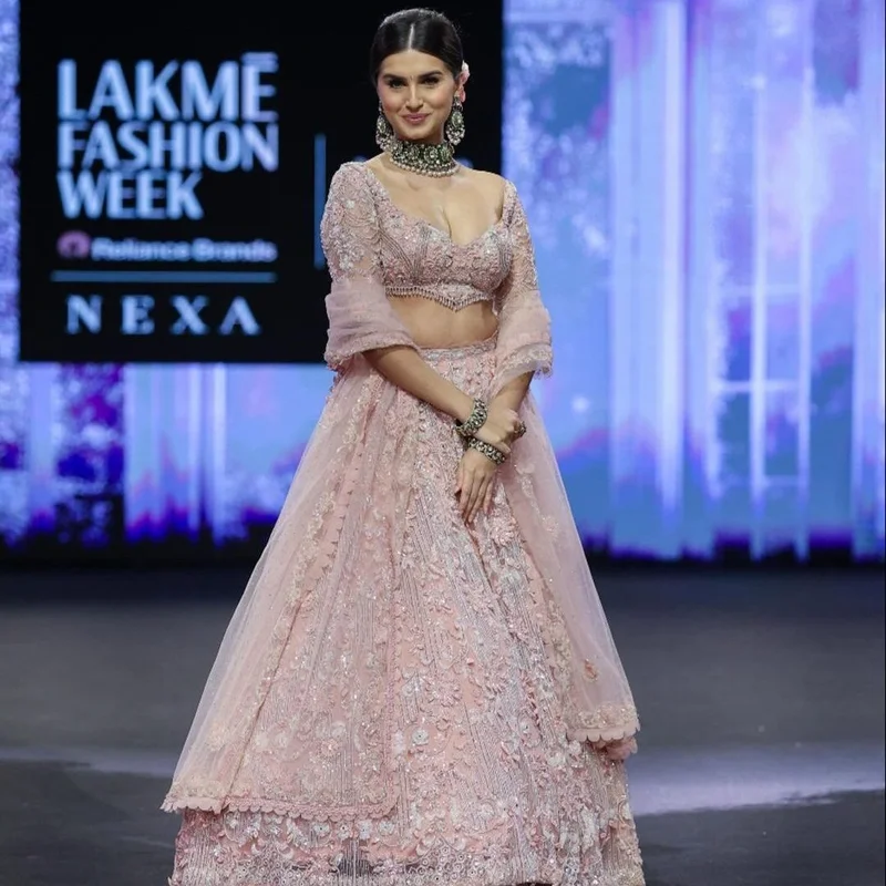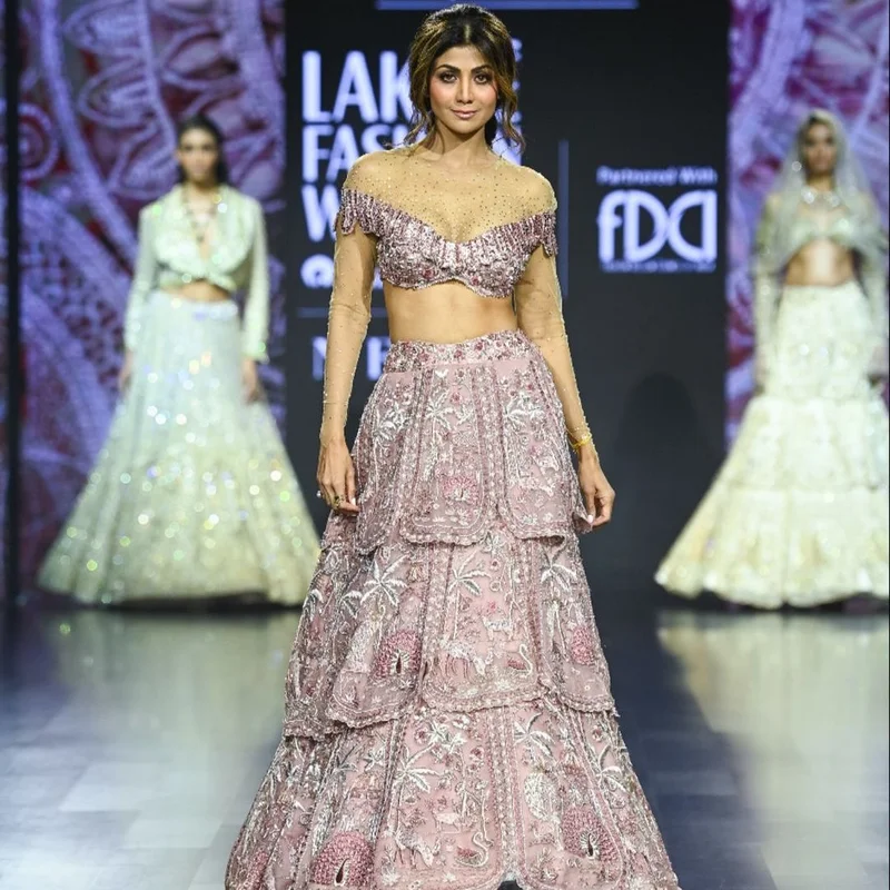 Actress Shilpa Shetty graced the runway in a stunning pink bridal lehenga from Megha Bansal’s latest collection, Khwaab—Khwaishyon Ka Shamiyana. She wore a beautiful three-layered lehenga paired with a matching off-shoulder blouse, adorned with sequined work, intricate embroidery, and shiny embellishments. She completed her look with a loose-braided hairstyle and a soft pink-toned makeup.