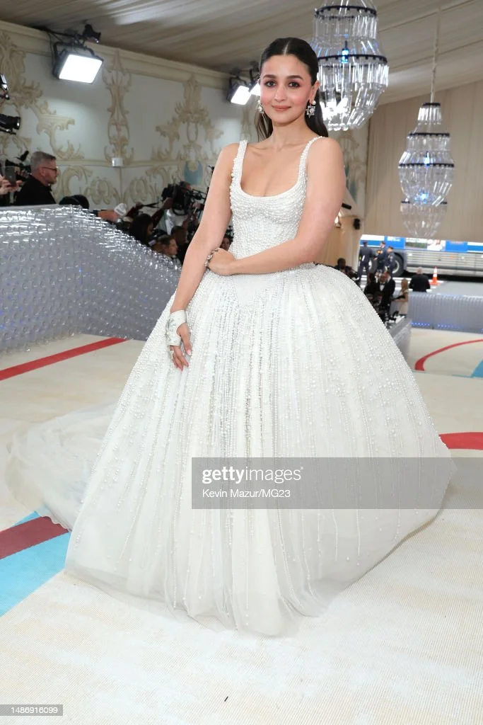 Making a strong debut at the Met Gala 2023, Alia Bhatt pearled up her dress, as pearls were a significant part of Karl’s style.