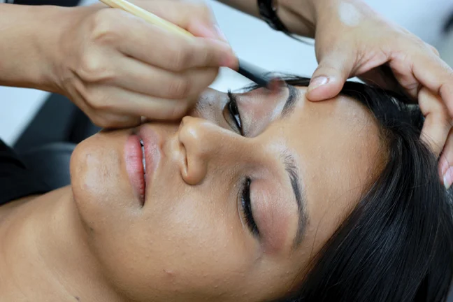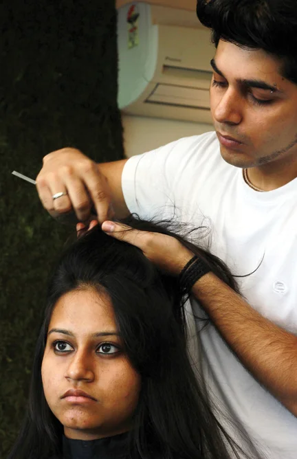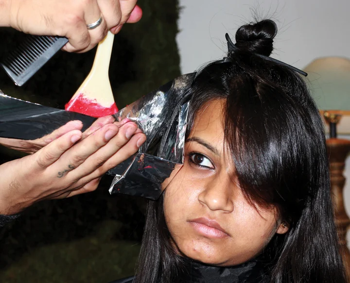 2. Next, a mix of L’oreal colours is applied to the lower ends of her hair. Shades of red and magenta are picked up to match the complexion of her face. This look isn’t gaudy, but subtle and trendy.