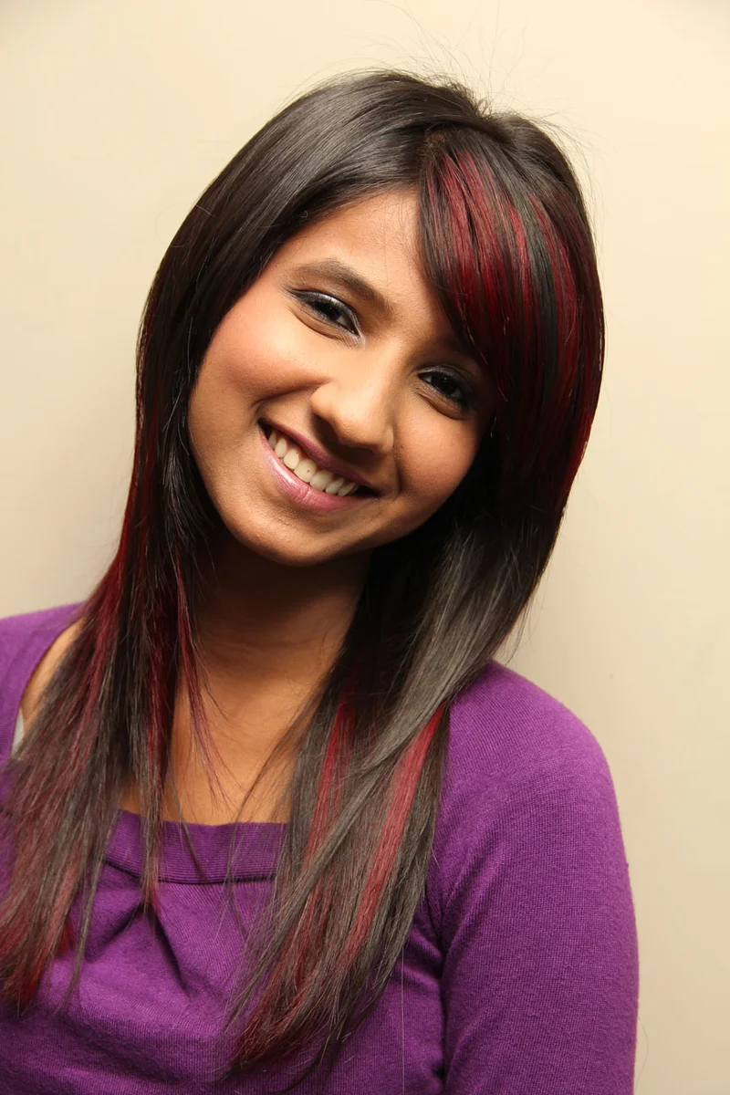 • Used magenta red panels to highlight her hair along with her fringe for an edgy look