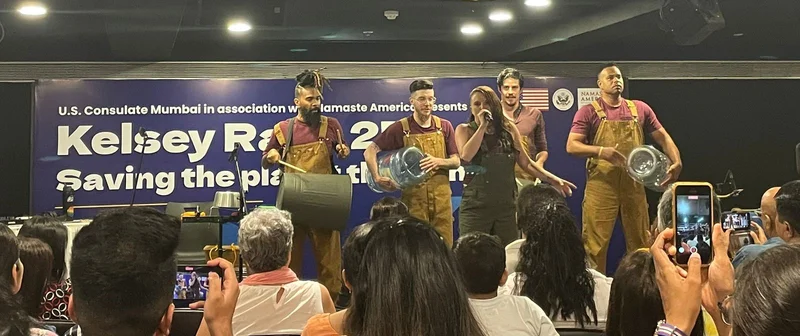 The US Consulate, Mumbai collaborated with Namaste America to host Kelsey Rae and 2B1’s live concert, “Saving the Planet Through Song” in Mumbai at Sri Shanmukhananda Fine Arts & Sangeetha Sabha, Sion on 25th April 2023. The concert was free for anyone to attend with prior registration. What came as a surprise element was the jam session with a Mumbai-based local band named Dharavi Rocks.