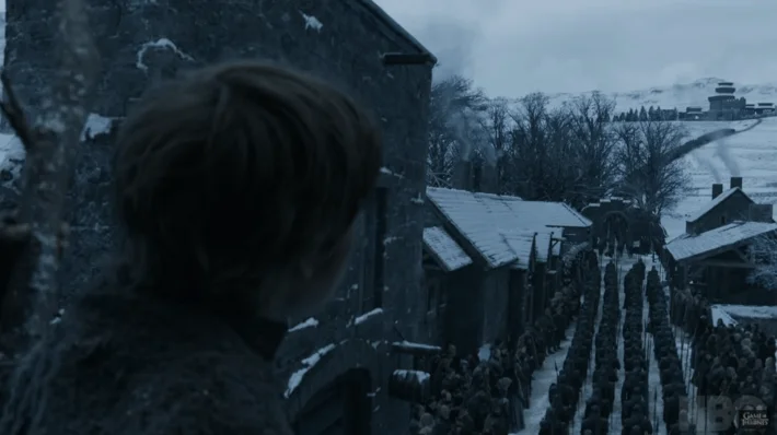6) The Unsullied have marched to Winterfell, setting the final scene of the battle between them and the White Walkers. Jon, Daenerys and the dragons have arrived at Winterfell as well! Jon is seen giving a small a pre-war speech about how their enemies don’t tire, nor do they stop.