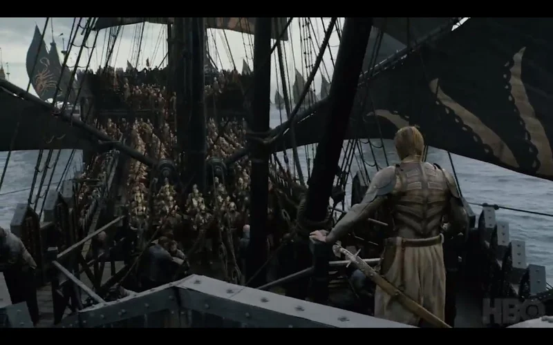 3) The first look of the Golden Company on the ships of Ironborn. The Golden Company is a powerful group of mercenaries from the Free Cities of Essos who have been hired by Cersei to help defeat her enemies after she sneakily faked an alliance with Jon and Daenerys at the end of Season 7. The Golden Company is presumably on their way to Kings Landing to help Cersei keep her hold on her kingdom. The new blonde character is a new addition named Harry Strickland who is being played by the talented Marc Rissmann.
