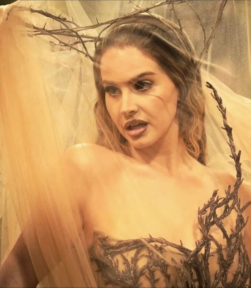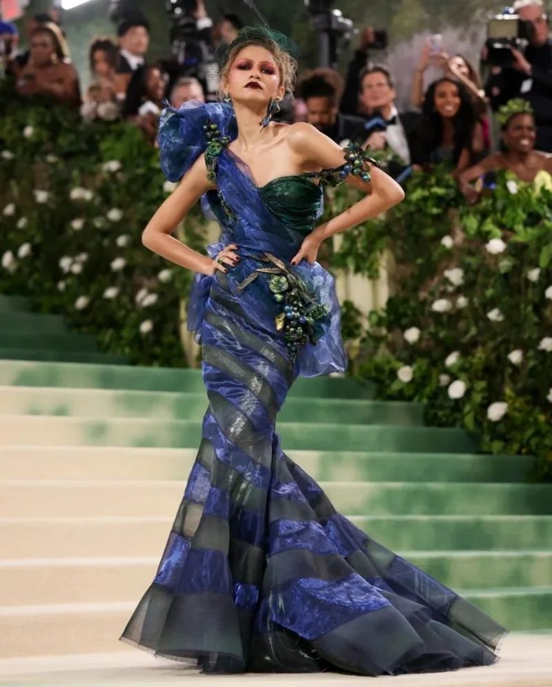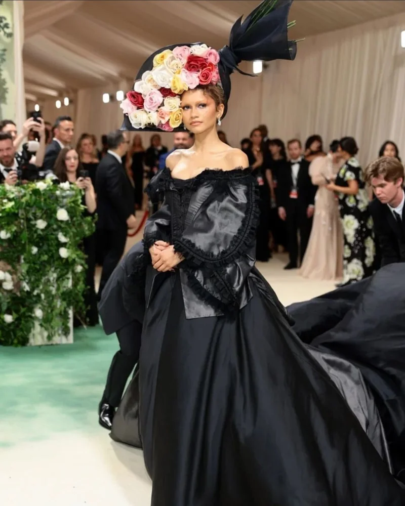 Zendaya, the “Challengers” actress embraced the dark angel look while wearing two of John Galliano’s designs. One was inspired by Dior 1999 which consisted of a stunning blue and green gown adorned by fruits and flowers along with a fascinator. The second look of the evening consisted of a black gown designed by John Galliano, a 1996 Givenchy piece which included a laced-up corset and a headpiece adorned by flowers. The uniqueness of her outfit made it one to remember.