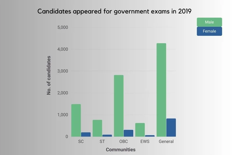 Additionally, take a look at the comparative bar graph for male and female candidates from different categories who appeared for government exams in 2019.