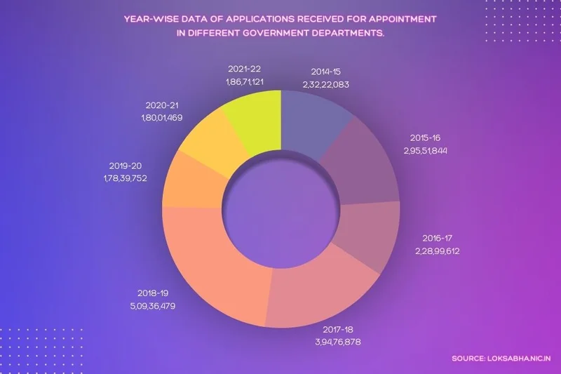 The pie chart below visually presents the information from a report on loksabha.nic.in. It displays the data, organized by year, regarding the number of applications received for job appointments in various government departments from 2014 to 2022.