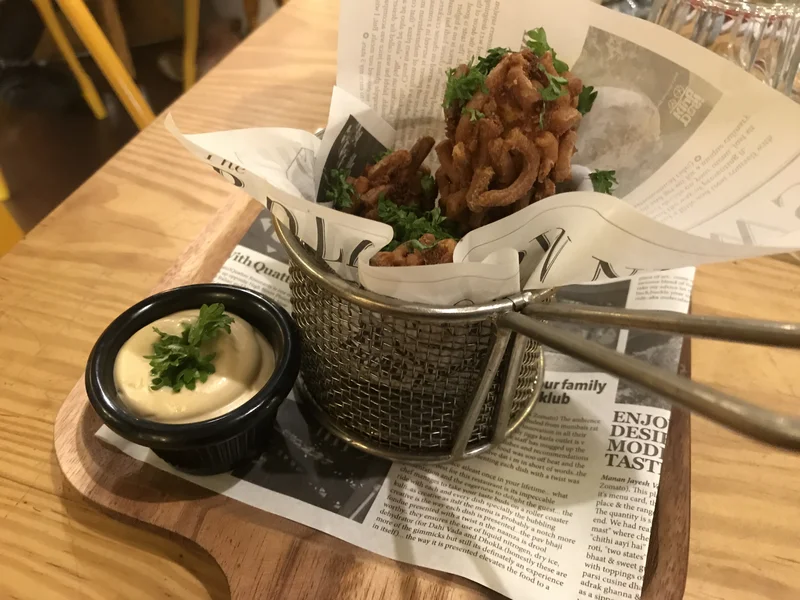 We started off with the Paneer Pretzel Strips – pretzel coated, deep fried, melt-in-your-mouth bits of paneer served with a dipping sauce. The portion, however, seems a little unfair for the price (INR 310) and the size of the Pretzel may not please you. We then went on to try the Colonel Fries, and it was everything you’d look for in a cheesy fries dish – lots of fries dunked in lots of melted cheese, with jalapenos, onions and sriracha sauce.