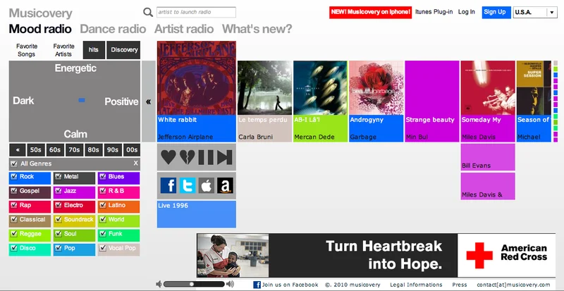 MUSICOVERY – Musicovery lets you play music according to your mood. All you have to do is pick out your mood on a graph based on how energetic or calm you are feeling and whether you want to listen to music that is positive or dark.