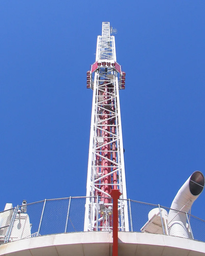 Big Shot is an atmospheric tower ride. At one point, it was the world’s highest amusement ride in terms of overall elevation above ground level. The 160 feet (49 m) tower is built atop the 921 feet (281 m) high deck of the Stratosphere in Las Vegas, Nevada.