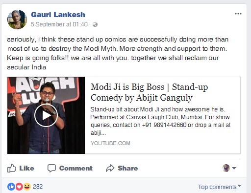 In an interview with Newslaundry in 2016, Gauri said “In Karnataka today, we are living in such times that Modi Bhakts and the Hindutva brigade welcome the killings (as in the case of Dr M M Kalburgi) and celebrate the deaths (as in the case of Dr U R Ananthamurthy) of those who oppose their ideology, their political party and their supreme leader Narendra Modi. In one of her last public talks she spoke about the issue of how journalists receive death threats and the growing events of violence against them by people in power.”
