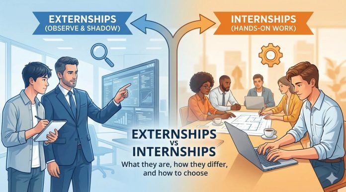 If you are trying to gain work exposure before graduating, internships are usually the first option that comes to mind. Externships often get overlooked, even though they can play an important role, especially early on. While both introduce you to professional life, they work in very different ways.