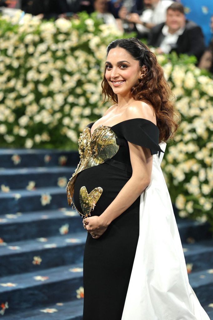 Kiara Advani made a poignant debut, embracing both couture and motherhood in a custom ensemble titled Bravehearts by designer Gaurav Gupta. The gown featured a sculpted antique gold breastplate adorned with two hearts that symbolized mother and child. It was interconnected by an abstract umbilical cord, representing the bond of new life. Complementing this was a dramatic white cape, paying homage to the late fashion icon André Leon Talley, and a structured black gown, embodying strength and elegance. The intricate creation required over 270 hours of meticulous craftsmanship, involving more than 23 artisans. Kiara’s appearance not only marked her first at the Met Gala but also stood as a tribute to her journey into motherhood.