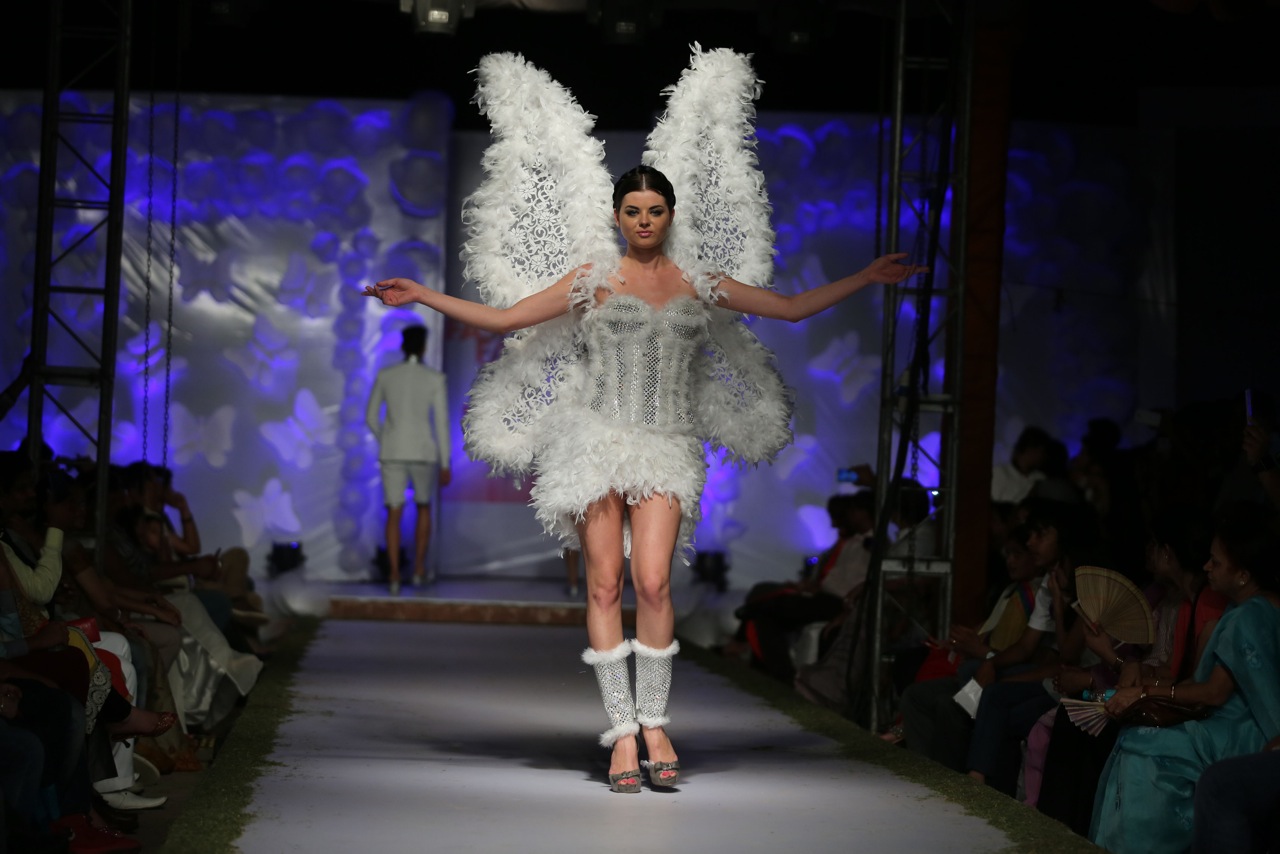 The themes of the garments designed by the students was Golden Paradise, depicting the beauty of the colour gold with floral arrangements using brief silhouettes in combination with velvet, net, lycra and zari; Melange which spread the brightness of florescent colour on the ramp with free flowing garments innovatively laid and draped in net and georgette and accessorised with beads and pearls; Dark Shadow which structured garments depicting the mystery of night with the use of velvet, rexin and net to enhance the beauty of the colour black; and Sin City which showcased sinful garments designed on the purest colour, white. The garments were made using fur, net, lycra and feathers. These ostentatious garments were accessorised with Swarovski crystals.