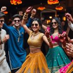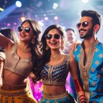 a fake sangeet party, genz in traditional attrire, but in genz fashion, enjoying in a club. one two wearing sunglasses, sleevless fashionable bouse and outfits